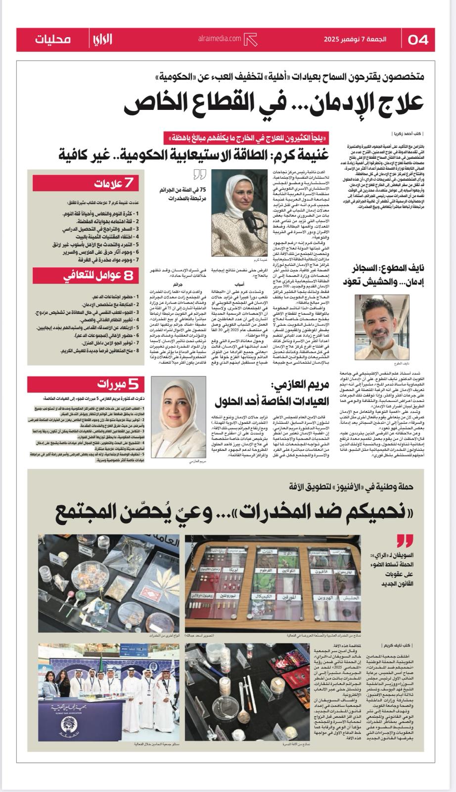 وأضافت «لذا أناشد الحكومة بالموافقة والسماح للقطاع الأهلي بفتح مصحات خاصة لعلاج الإدمان داخل الكويت، حتى لا يضطر الموطنون والمقيمون للسفر، كما أقترح زيادة عدد المباني لتضم أعداداً أكثر من الأسرة ونأمل كذلك في افتتاح أفرع لمركز علاج الإدمان في كل محافظة، وكذلك تعديل التشريعات والقوانين الخاصة بالإدمان لتتماشى مع طبيعة المرض حتى نضمن نتائج إيجابية بالعلاج».