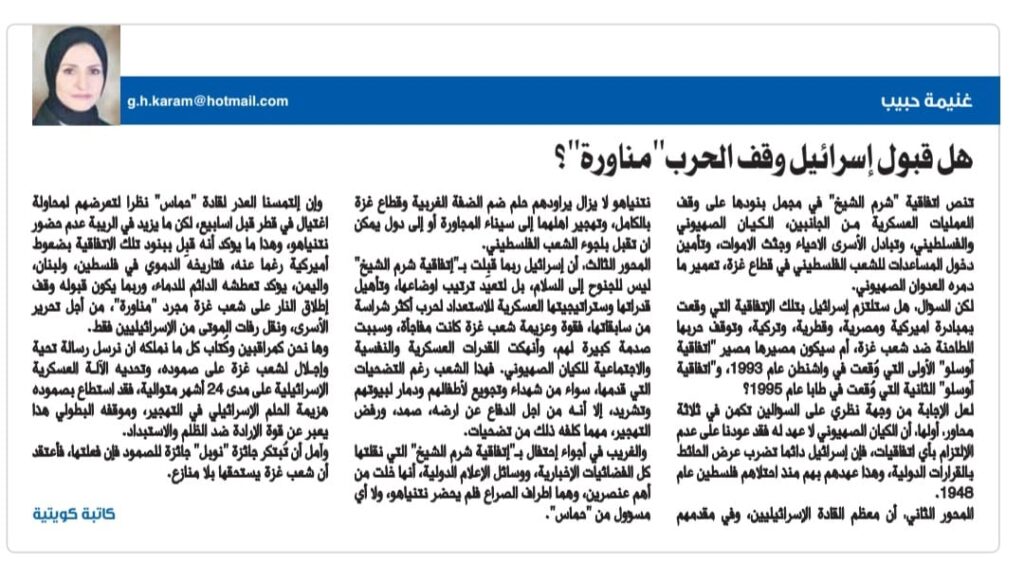 تنص اتفاقية “شرم الشيخ” في مجمل بنودها على وقف العمليات العسكرية من الجانبين، الكيان الصهيوني والفسلطيني، وتبادل الأسرى الاحياء وجثث الاموات، وتأمين دخول المساعدات للشعب الفلسطيني في قطاع غزة، تعمير ما دمره العدوان الصهيوني. لكن السؤال: هل ستلتزم إسرائيل بتلك الإتفاقية التي وقعت بمبادرة اميركية ومصرية، وقطرية، وتركية، وتوقف حربها الطاحنة ضد شعب غزة، أم سيكون مصيرها مصير “اتفاقية أوسلو” الأولى التي وُقعت في واشنطن عام 1993، و”اتفاقية أوسلو” الثانية التي وُقعت في طابا عام 1995؟ لعل الإجابة من وجهة نظري على السؤالين تكمن في ثلاثة محاور: أولها: أن الكيان الصهيوني لا عهد له فقد عودنا على عدم الإلتزام بأي اتفاقيات، فإن إسرائيل دائما تضرب عرض الحائط بالقرارات الدولية، وهذا عهدهم بهم منذ احتلاهم فلسطين عام 1948. المحور الثاني: أن معظم القادة الإسرائيليين، وفي مقدمهم نتنياهو لا يزال يراودهم حلم ضم الضفة الغربية وقطاع غزة بالكامل، وتهجير اهلهما إلى سيناء المجاورة أو إلى دول يمكن ان تقبل بلجوء الشعب الفلسطيني. المحور الثالث: أن إسرائيل ربما قبِلت بـ”إتفاقية شرم الشيخ” ليس للجنوح إلى السلام، بل لتعيد ترتيب اوضاعها، وتأهيل قدراتها وستراتيجيتها العسكرية للاستعداد لحرب أكثر شراسة من سابقاتها، فقوة وعزيمة شعب غزة كانت مفاجأة، وسببت صدمة كبيرة لهم، وأنهكت القدرات العسكرية والنفسية والاجتماعية للكيان الصهيوني. فهذا الشعب رغم التضحيات التي قدمها، سواء من شهداء وتجويع لأطفالهم ودمار لبيوتهم وتشريد، إلا أنه من اجل الدفاع عن ارضه، صمد، ورفض التهجير، مهما كلفه ذلك من تضحيات. والغريب في أجواء إحتفال بـ”إتفاقية شرم الشيخ” التي نقلتها كل الفضائيات الإخبارية، ووسائل الإعلام الدولية، أنها خلت من أهم عنصرين، وهما اطراف الصراع فلم يحضر نتنياهو، ولا أي مسؤول من “حماس”.